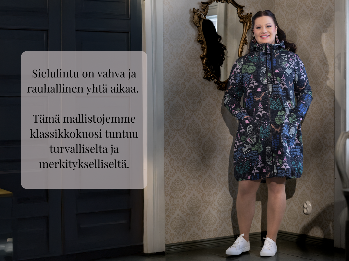 Kaikuja verannalta -malliston toinen droppi tuo yhteen tunnetta, tarinoita ja vahvoja kuoseja. Rakkaudella, Love You, Wild, Salaisuus ja paljon toivottu Sielulintu muodostavat kokonaisuuden, jossa lempeys ja rohkeus kulkevat rinta rinnan. Jokainen kuosi on oma maailmansa, mutta yhdessä ne luovat lempivaatteita arkeen ja juhlaan – vaatteita, joissa saa olla oma itsensä.