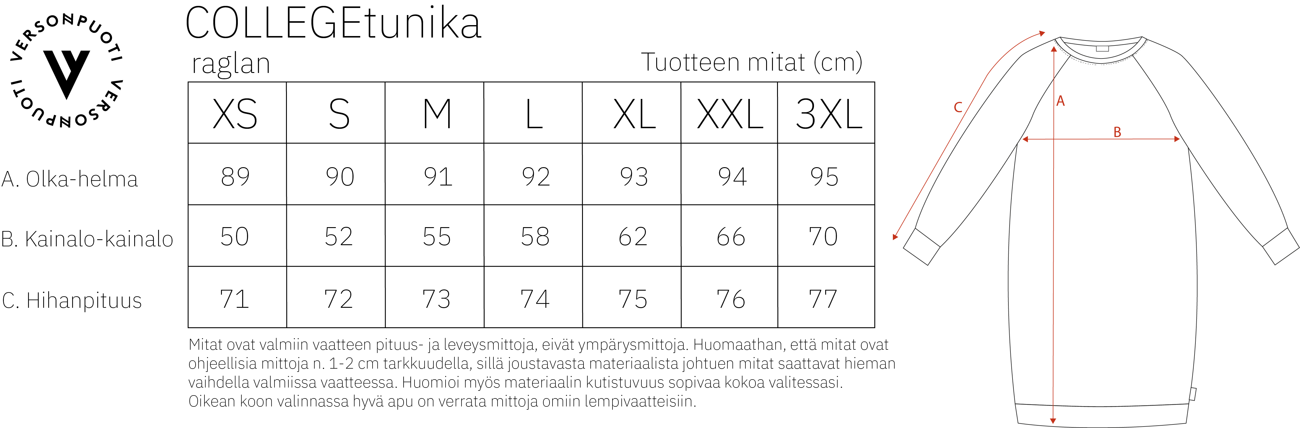 Raglanhihainen COLLEGEtunika on mainio valinta jokapäiväiseen vaatetukseen ja tuoteesta on tullut monelle se oma lempivaate. Hihansuissa on resorit ja sivusaumoissa on taskut, joissa voit kuljettaa pieniä tärkeitä tavaroita mukana. Monelle COLLEGEtunika on pituudeltaan juuri mainio puettavaksi leggingsien ja sukkahousujen kanssa. Myös erilaiset housut voivat olla sopiva valinta tunikan pariksi. Tämä pitkähihainen tunika on mitoitukseltaan erilainen kuin mallistossamme oleva holkkihihainen COLLEGEtunika. Holkkihihaiseen ystäväänsä verrattuna tämä raglanhihainen tunika on miehustaltaan hieman kapeampi, helmaltaan hiukan lyhyempi ja pääntie on hieman avarampi. Jos kokoa valitessasi havaitset oman kokosi olevan kahden koon välimaastossa, valitse suurempi koko, sillä college kutistuu aina jonkin verran pesussa.