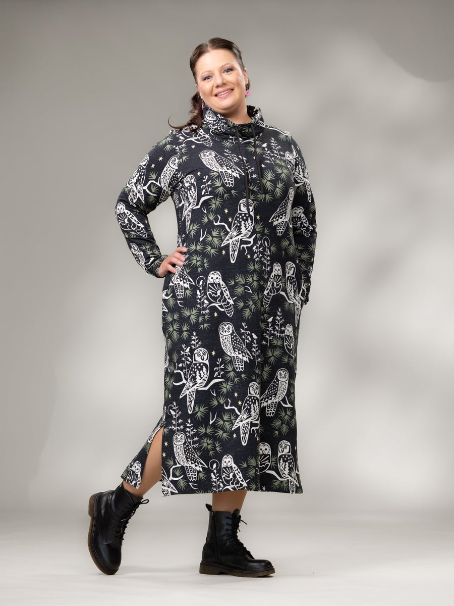 Tyylikäs ja miellyttävä pitkähihainen joustocollegemekko, jossa on trendikäs halkioin varustettu helma. Korkea tuubikaulus ja nyörit tuovat lisää ilmettä tälle ihanan ilmavasti istuvalle pitkähelmaiselle collegemekolle. TAUKOmekko sopii täydellisesti rentoihin päiviin ja asustamalla sen voi hyvin pukea myös juhlavampaankin menoon. Rintamuotolaskokset tuovat istuvuutta etukappaleella ja sivusaumojen taskut viimeistelevät käyttömukavuuden.