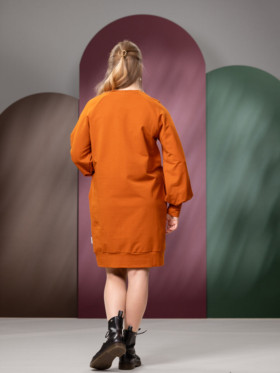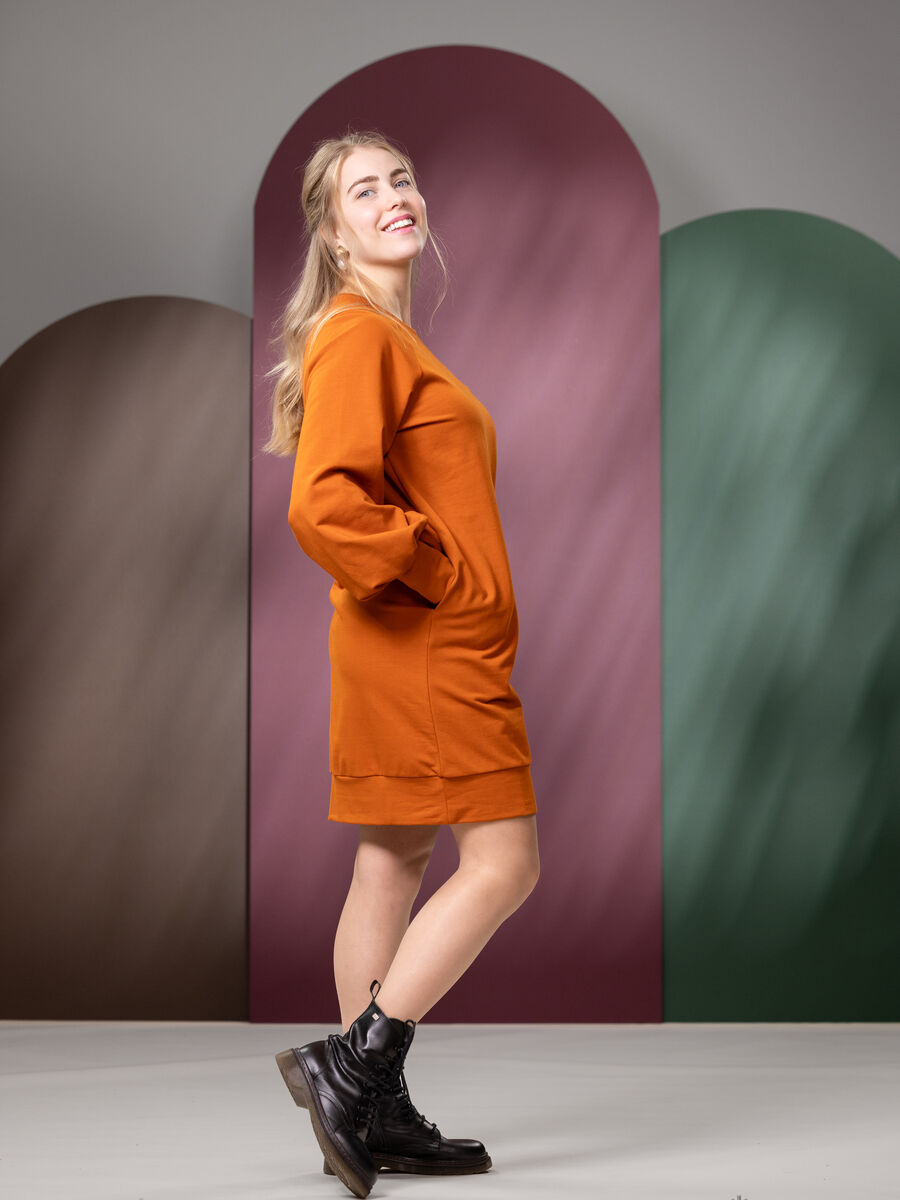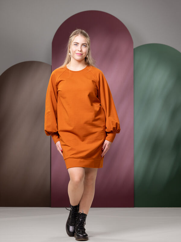 Pitkähihainen, miellyttävästä joustocollegesta valmistettu HILMAmekko raglanhihalla! Mekossa on rento mitoitus ja naisellisen näyttävissä puhvihihoissa on resorit, joita voi tarvittaessa kääntää. HILMAmekossa on erinomainen helman pituus ja se sopii mainiosti käytettäväksi leggingsien tai sukkahousujen kanssa. Myös erilaiset housut sopivat etenkin pidemmälle käyttäjälle tämän collegemekon kaveriksi. Sivusaumoissa on käyttömukavuutta tuovat taskut.