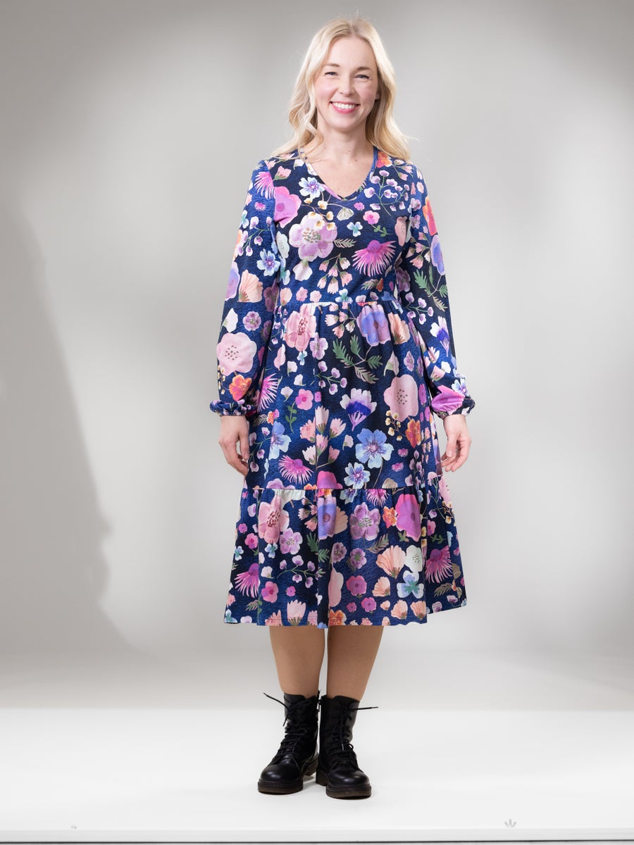 Pitkähihainen SANDRAmekko on toivottu, upea, frillahelmainen kerrosmekko näyttävällä helman pituudella. Tyylikäs v-pääntie ja pitkät pussimaiset hihat antavat mekolle naisellisen ja elegantin ilmeen. Vyötärösaumaan ommeltu kevyt kuminauha pitää istuvuuden ryhdikkäänä. Sivusaumoissa on taskut.