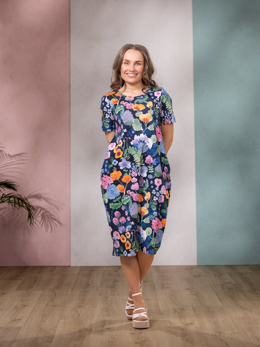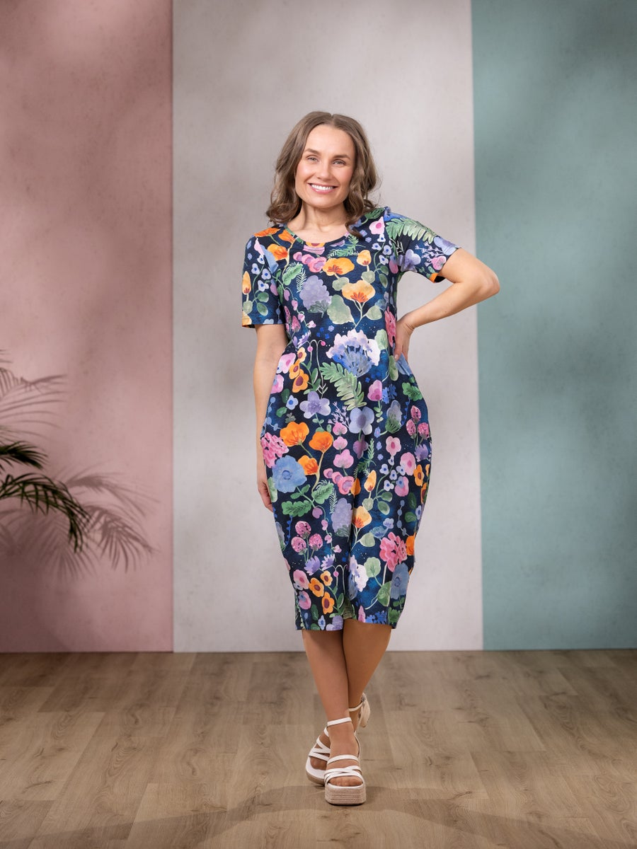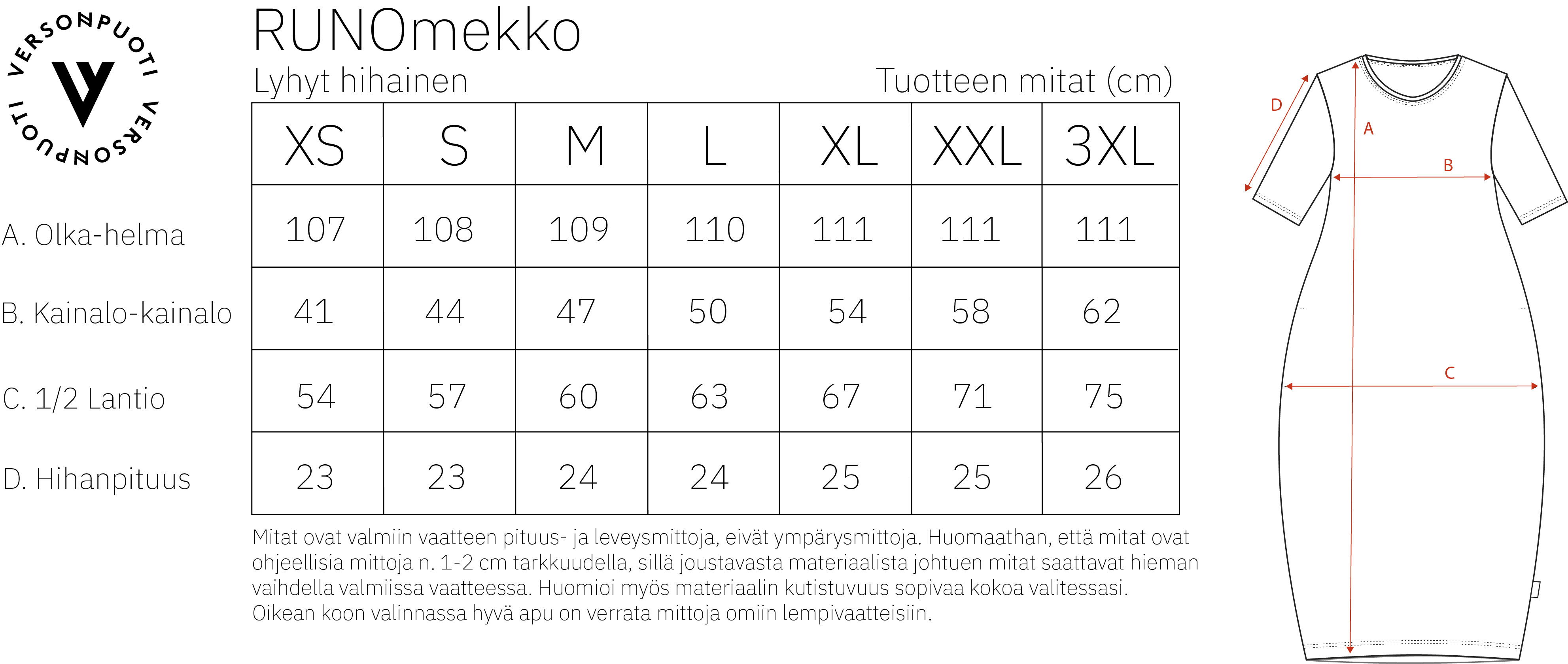Tämä ihana naisten mekko sopii mainiosti erilaisille vartalotyypeille. Lyhyet hihat ja kauniin mallisella o-pääntiellä varustettu miehusta ovat hyvin istuvat, mekon keskiosassa on mukavaa väljyyttä. Lyhythihainen RUNOmekko kapenee sirosti helmaa kohti. Sivusaumoissa on taskut. Voit muokata mekon ilmettä helposti asusteilla, esimerkiksi vyöllä saat korostettua vyötäröä ja tuotua kokonaisuuteen uutta tyyliä.
