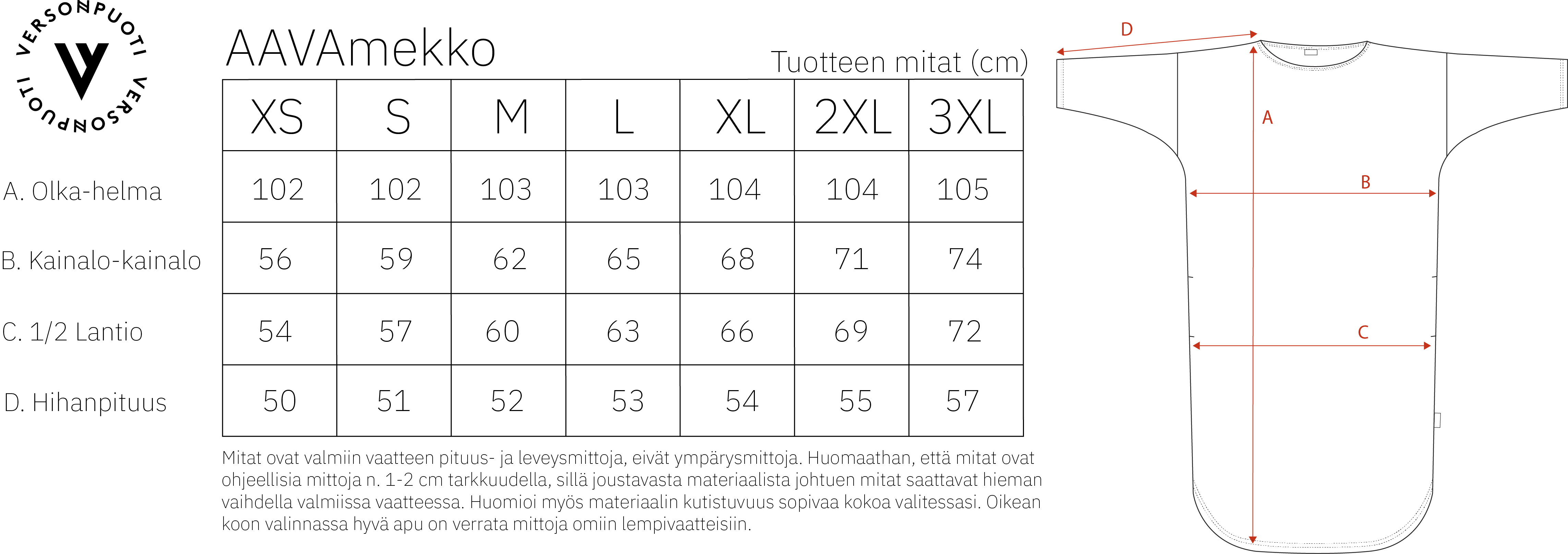 Valitse oma tyylisi mukaan pienempi koko niukempaan linjaan tai ota reilumpi koko trendikkääseen oversize-lookiin. Kesällä AAVAmekko toimii täydellisesti bikersien tai shortsien kanssa, ja viileämmillä säillä sen pariksi sopivat leggingsit tai suosikkihousut.