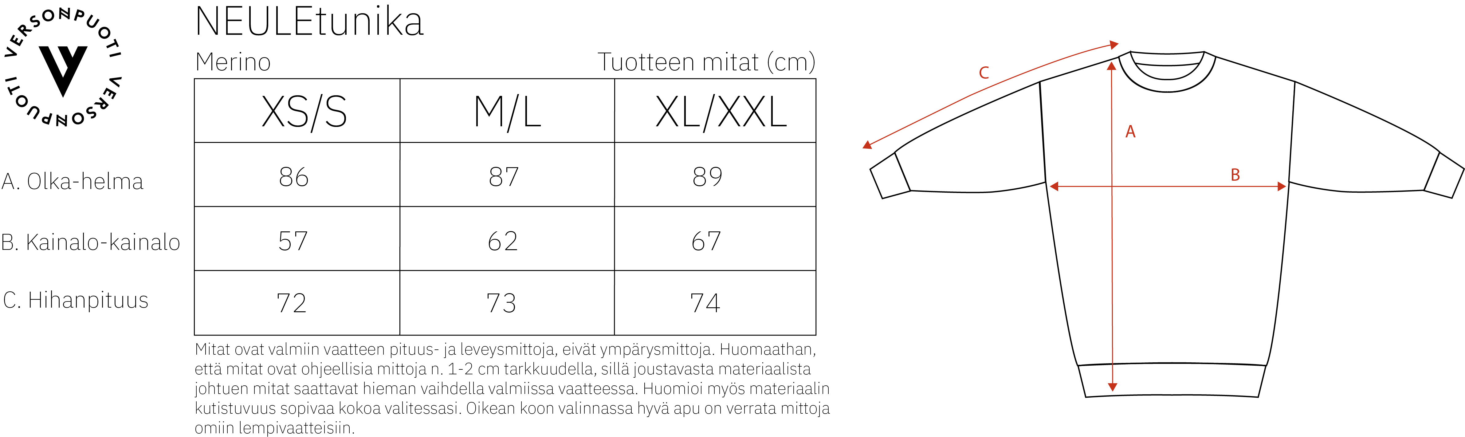 Neuletunika upealla Pohjoisen kutsu -kuosilla on valmistettu 100 % merinovillasta ja neulottu Suomessa, huolella ja rakkaudella. Materiaali on hengittävä ja pehmeä ihoa vasten, joten se sopii erinomaisesti ympärivuotiseen käyttöön. NEULEtunika on myös mitä ihanin lahjatuote!