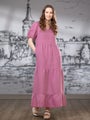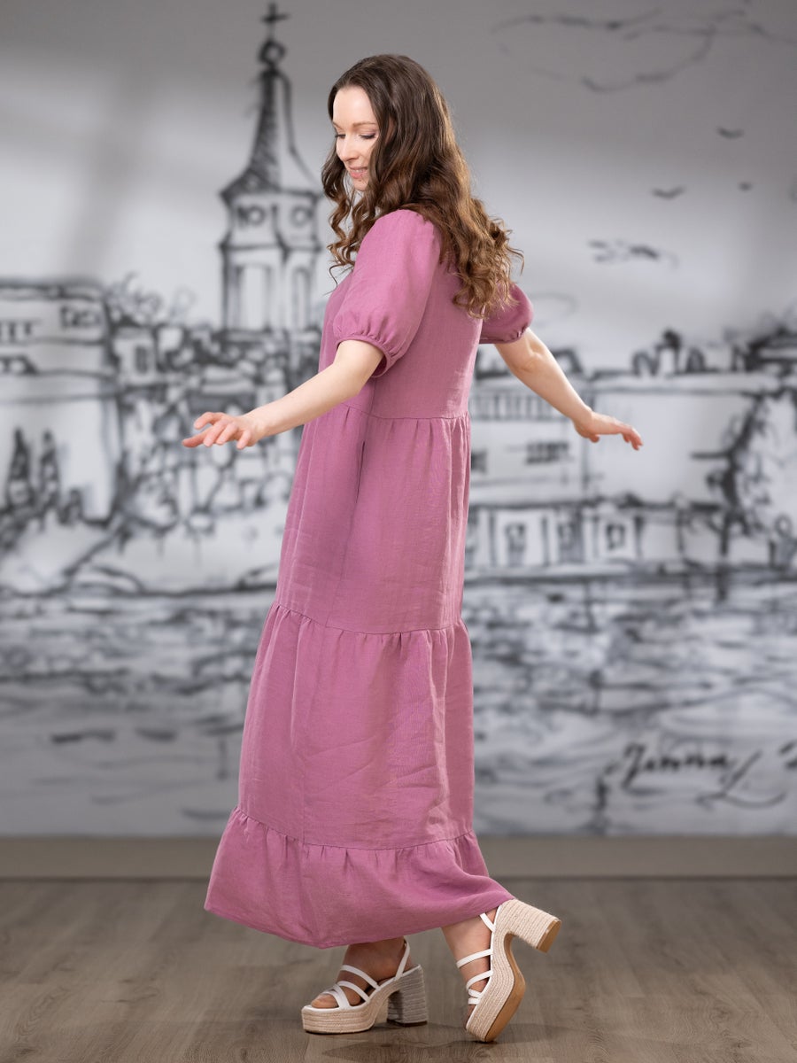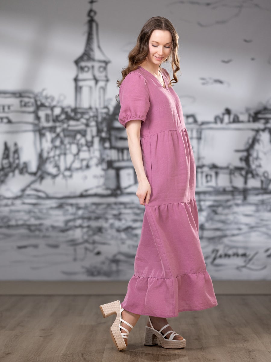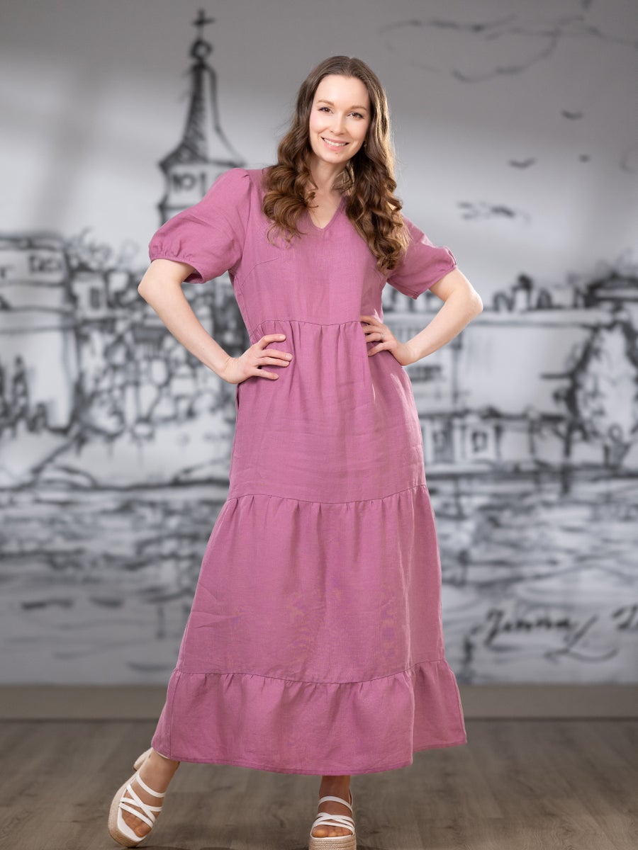 V-pääntie korostaa yläosaa kauniisti ja väljät, kevyesti poimutetut hihat tuovat ilmeeseen pehmeyttä ja liikettä. Mekon helma koostuu kolmesta poimutetusta kerroksesta, jotka luovat ilmavan ja elävän kokonaisuuden jokaisella askeleella. Edessä olevat muotolaskokset viimeistelevät istuvuuden ja tekevät siluetista huolitellun.